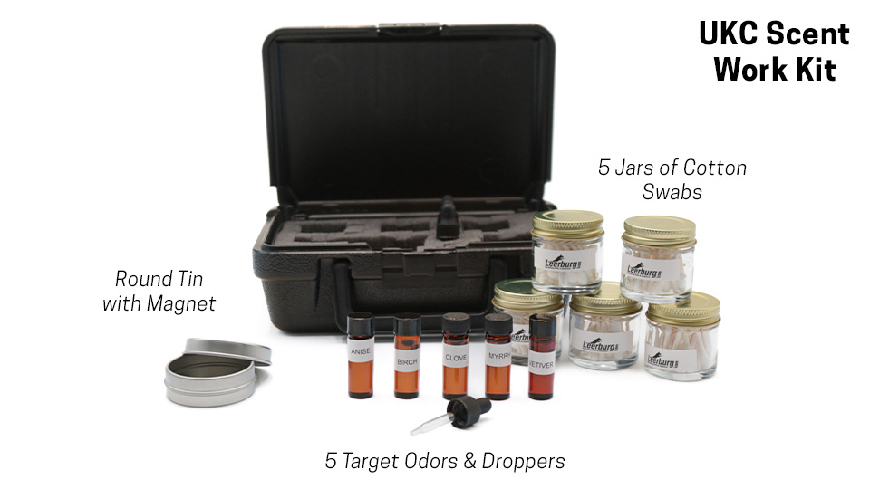 The UKC Nosework Kit is a small portable training aid that allows you to train nosework anywhere, anytime. This kit contains five target odors used in UKC Scent Sport that people train nosework dogs to search for as well as everything else you will need to get started in nosework.
