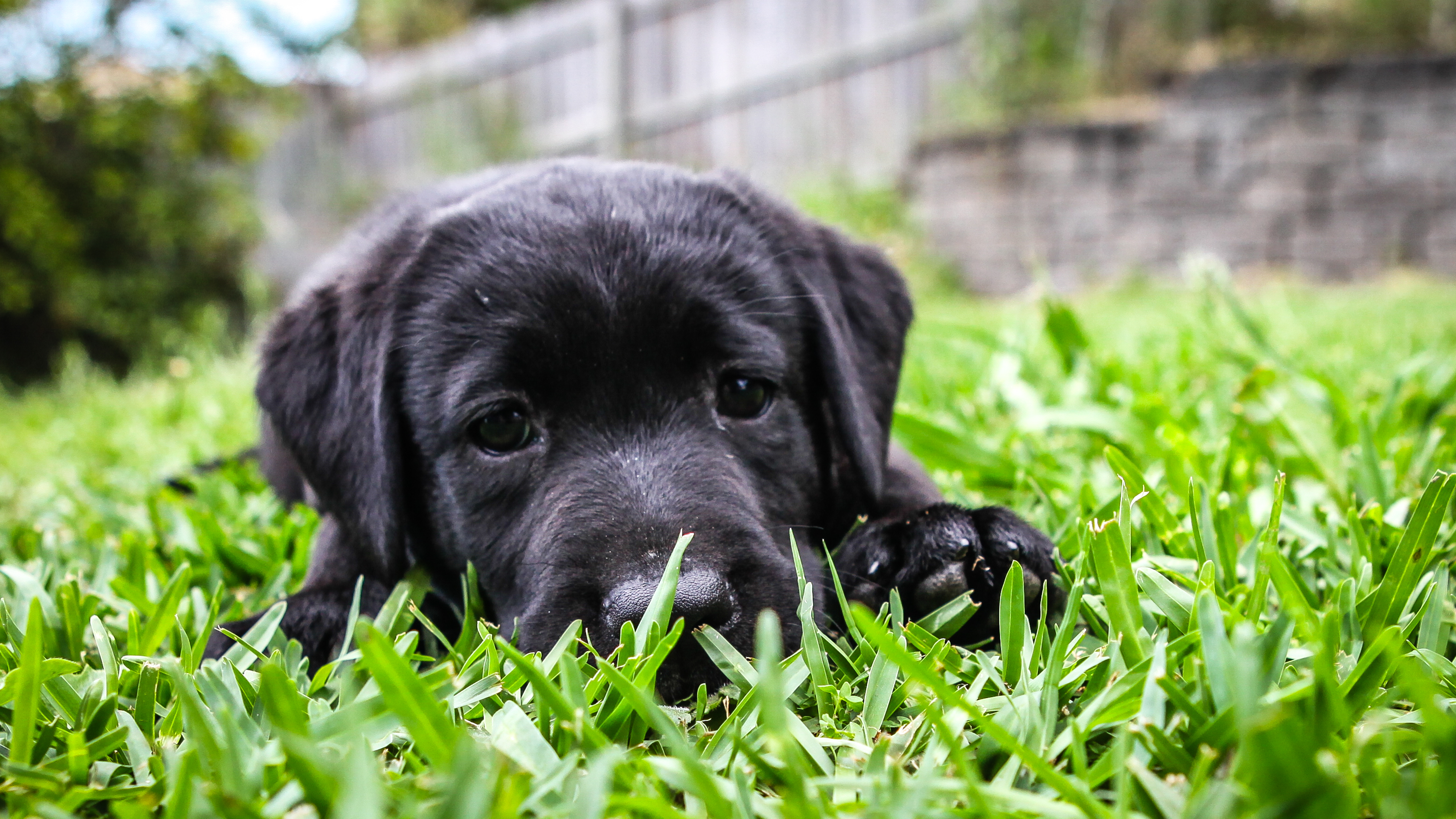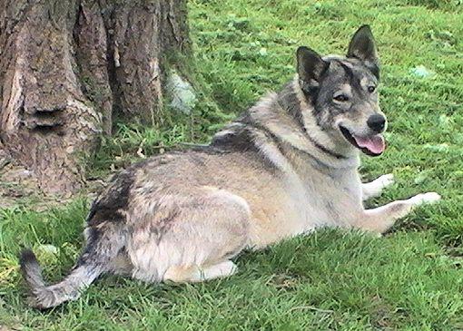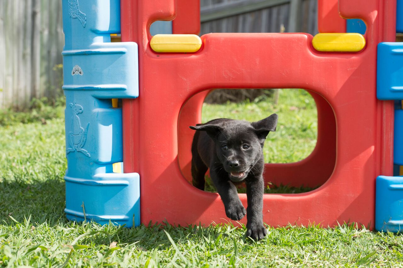 Tica, 2 yr black GSD, service dog in training, doing a down in the lawn.