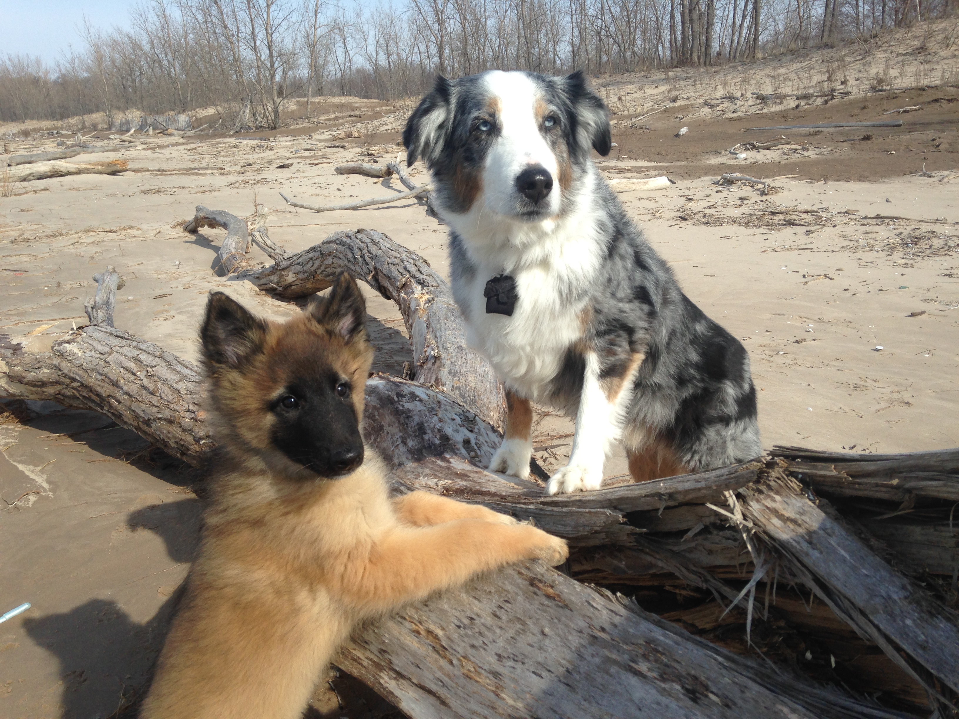 My ten year old Australian Shepherd,Noah,and my nine week old Belgian Tervuren,Trigger,at a local beach on an unusually warm winter day.
