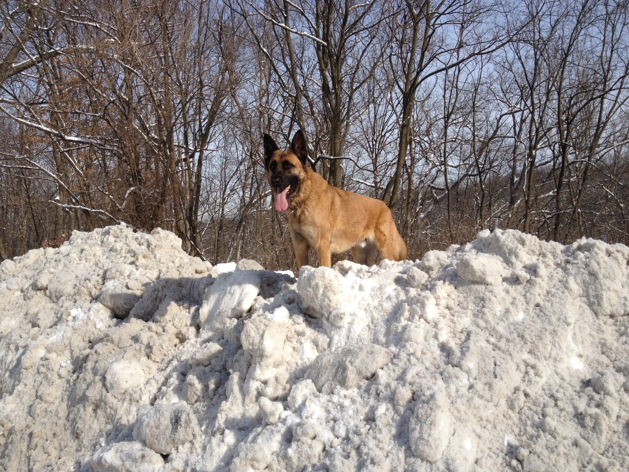 There was a large snow fall and no where to go with the snow so the Parks Dept. Piled it in there maintenance area. While exercising,Max decided to see what he could see from the top of the snow mound.