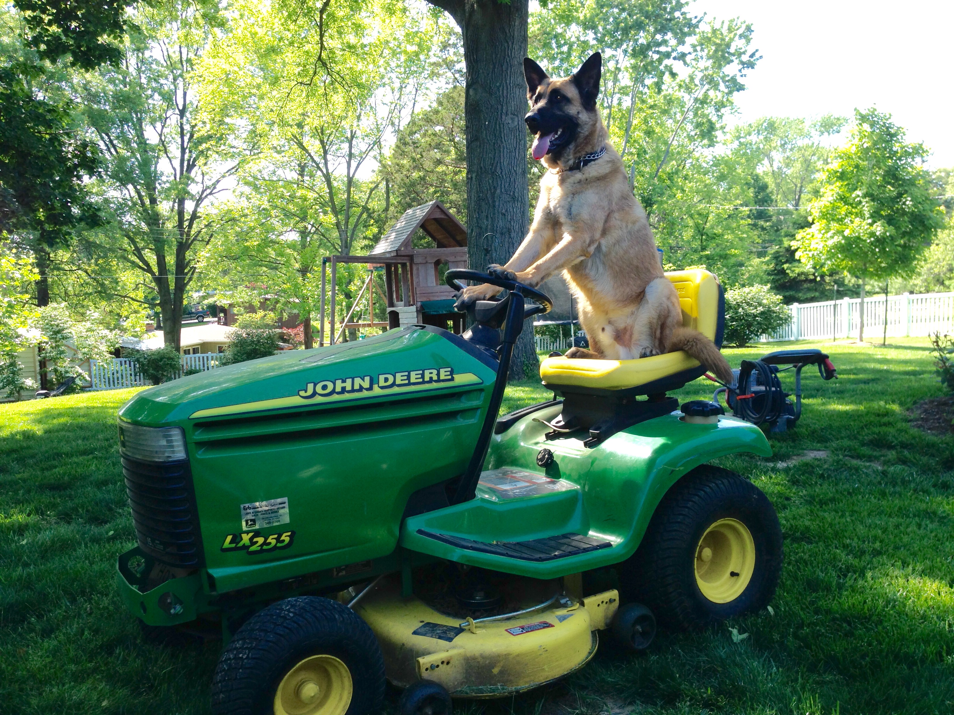 K-9 Max wanting to be like dad. He has an obsession with wanting to be on my John Deer riding lawnmower. He will follow me around the yard while I mow so I decided to let him see what it is like to sit in the driver's seat
