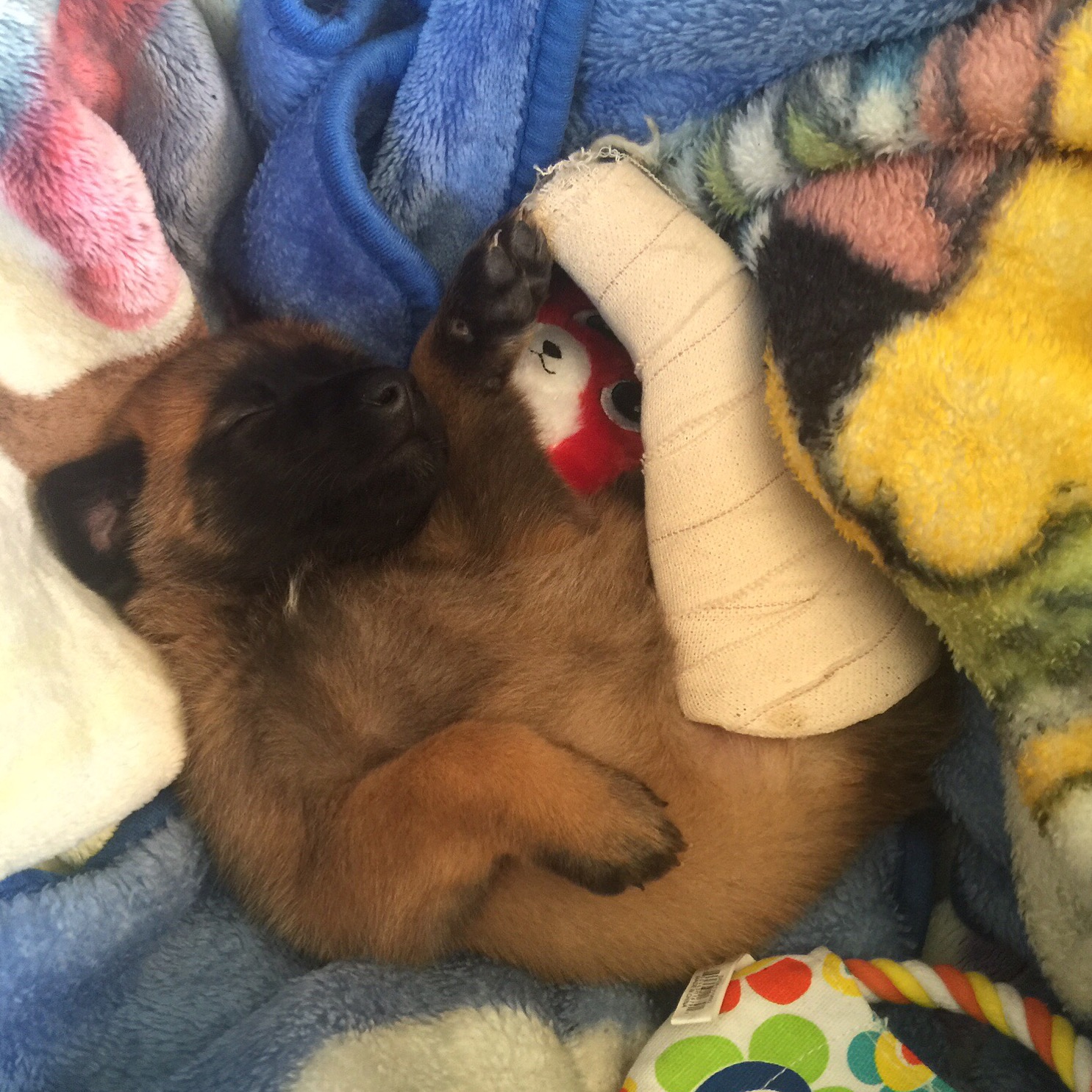 Jade,my Belgian Malinois,taking a nap after patching up a broken leg of hers.