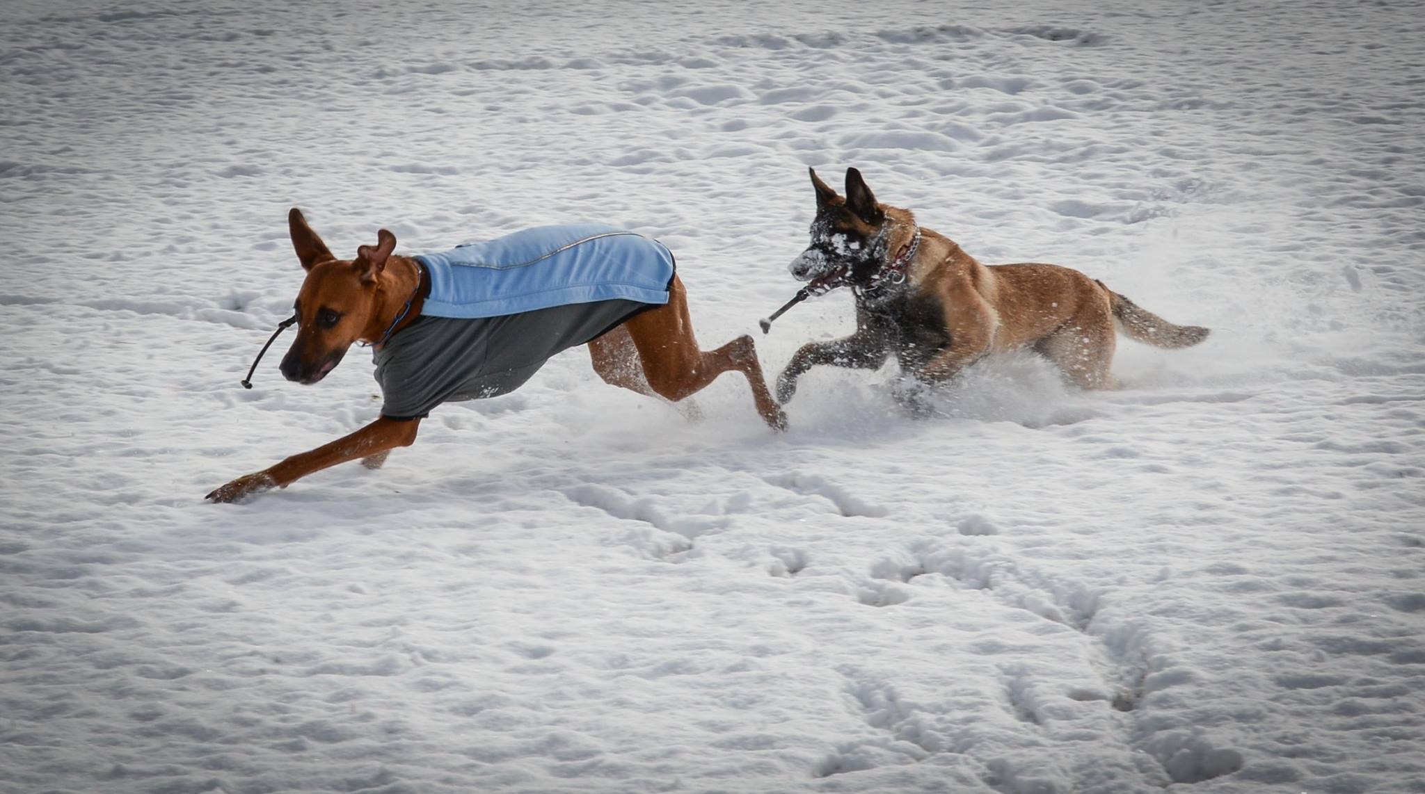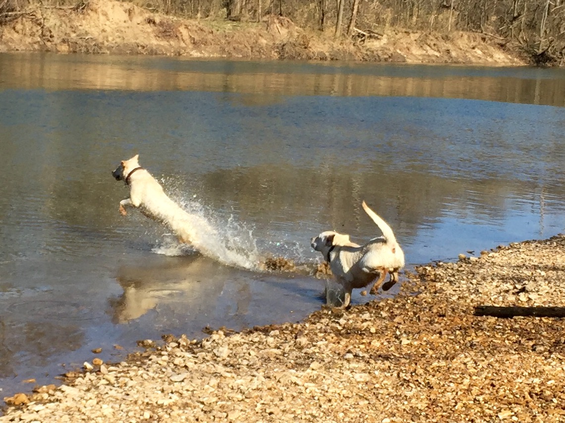 My dogs are excitedly running for the river on a beautiful spring day!