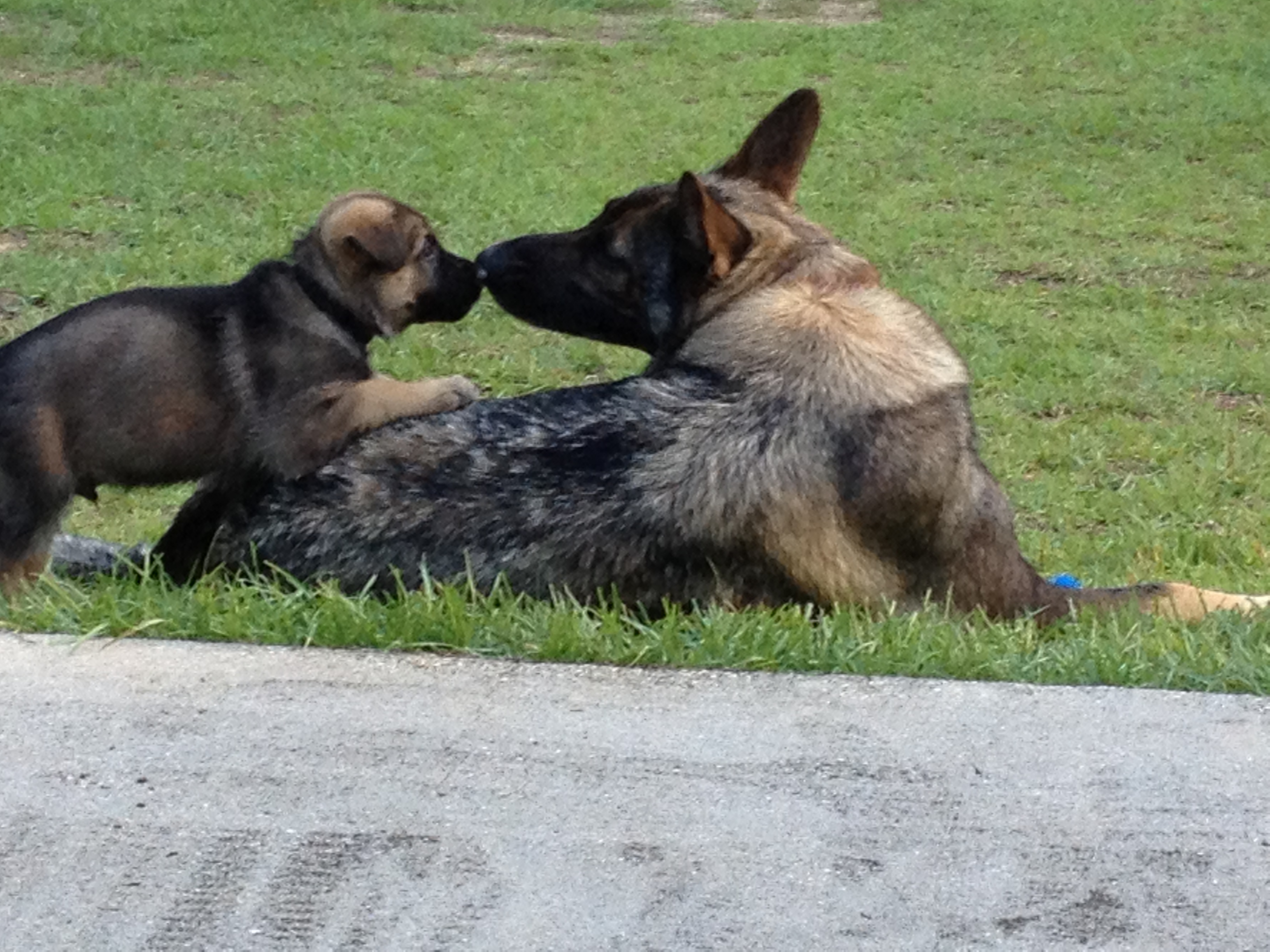 4 months old GSD puppy comforting a 12 year old GSD who can't walk because she is suffering from DM-degenerative myelopathy.