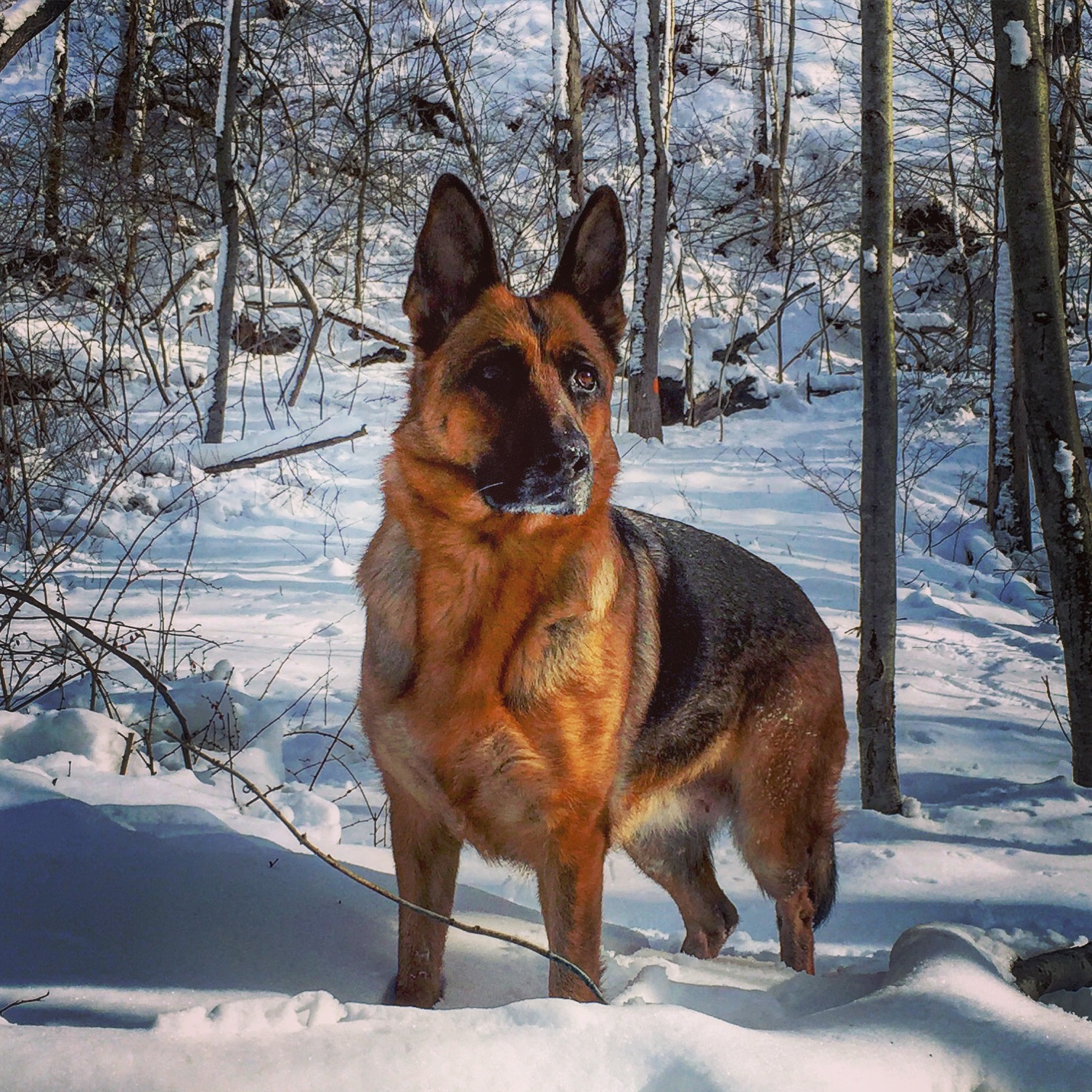 This is my dog playing in the snow! I just happen to catch him in this aggressive looking pose but Sy is really a sweetie.