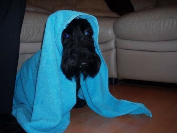 Micky the Scottish terrier just you of the shower doing a toad impression