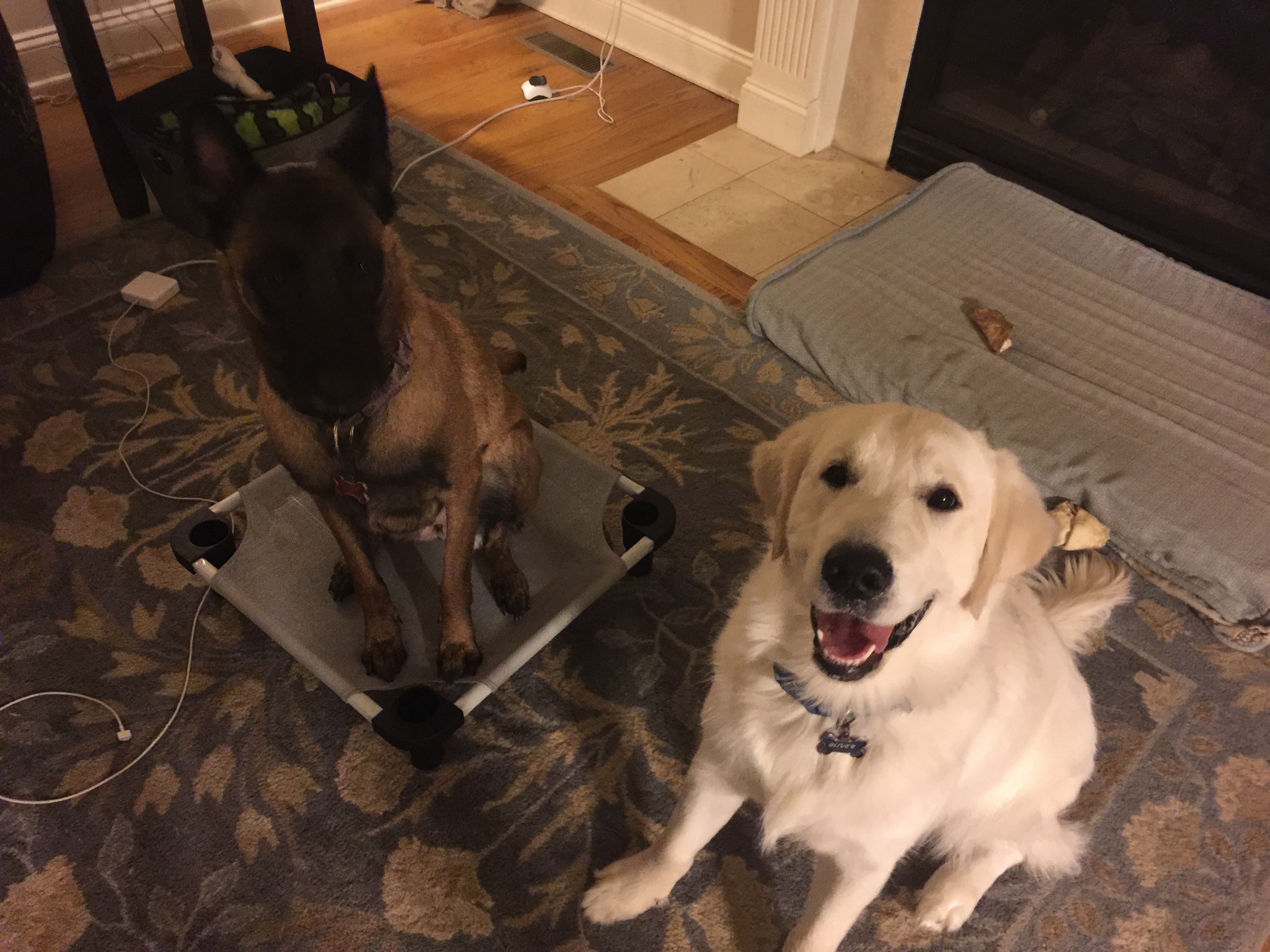 Hawkitt, male dutch shepherd and Cinder, female belgian malinois, enjoy a moment on Bramley Mountain in the western Catskills.