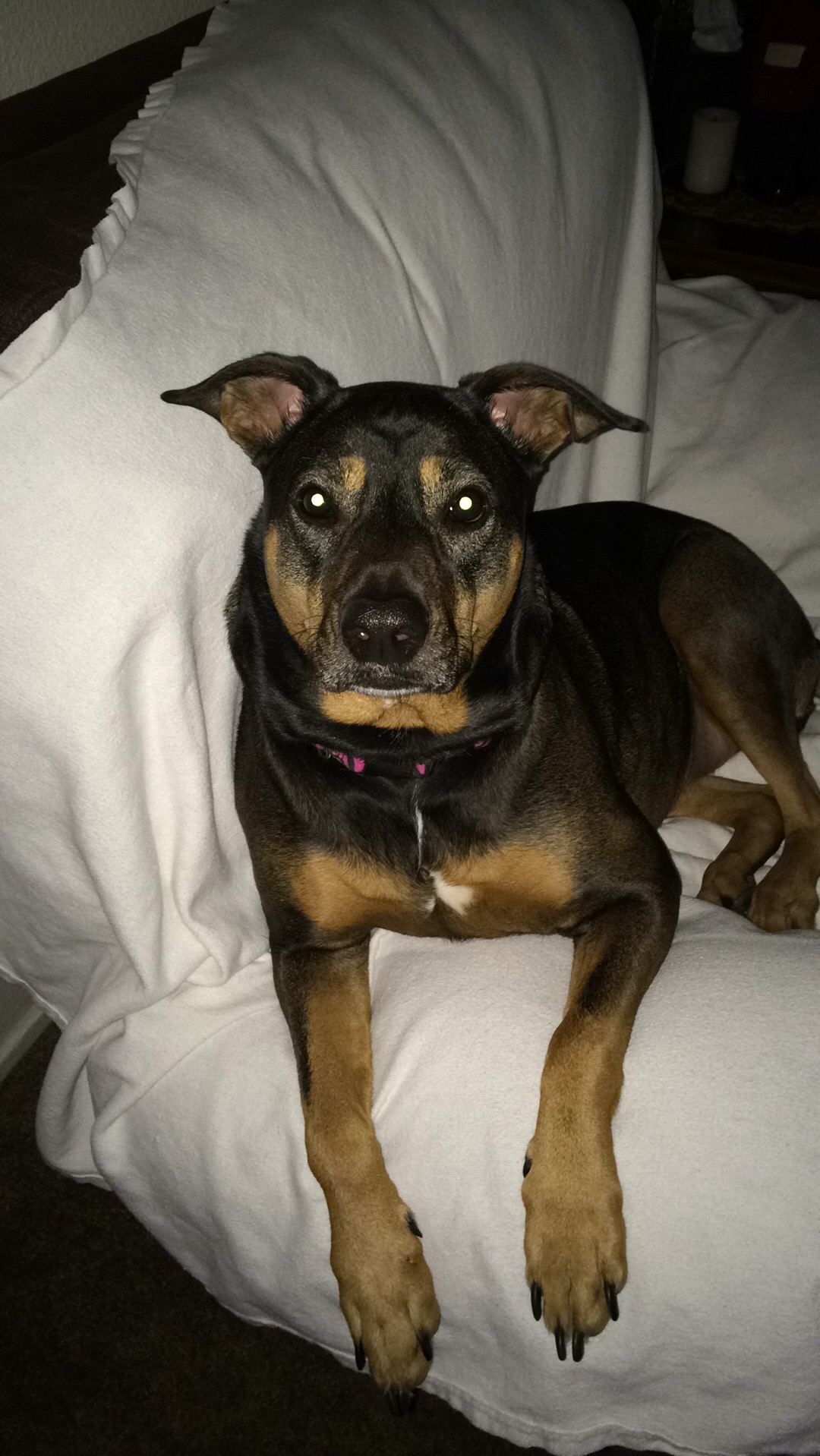 Hi I'm Savannah. I like to pose for my mommy and I just became her emotional support dog. I am a rescue dog and I love to eat diner with my mom. I can eat off a fork and love my dog granola bars. I also have to sleep up by my mom with my head in the pillow and I love to play in the snow.