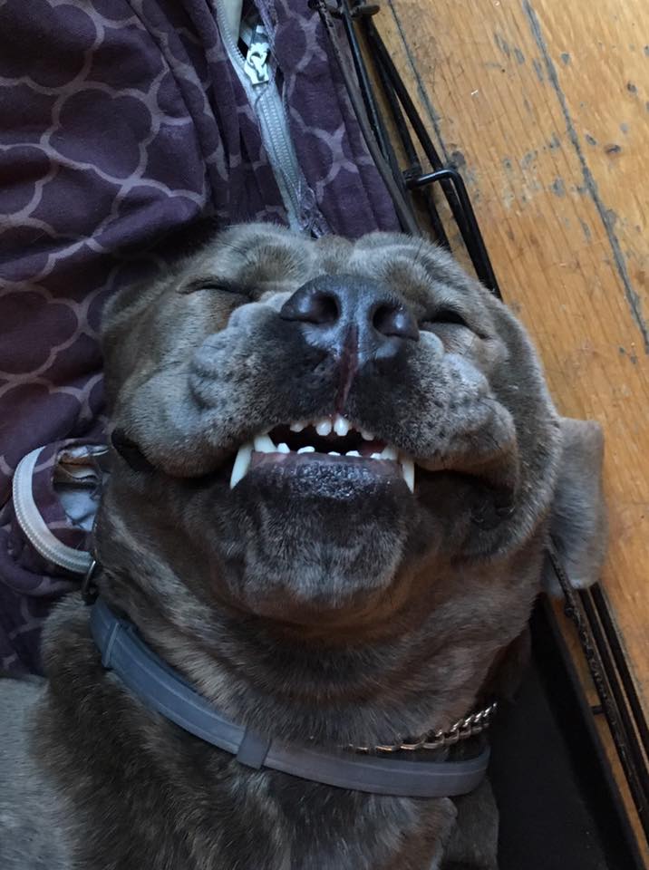 Moxie a 2.5 year old Belgian Malinois practicing her smile with her Gator friend.