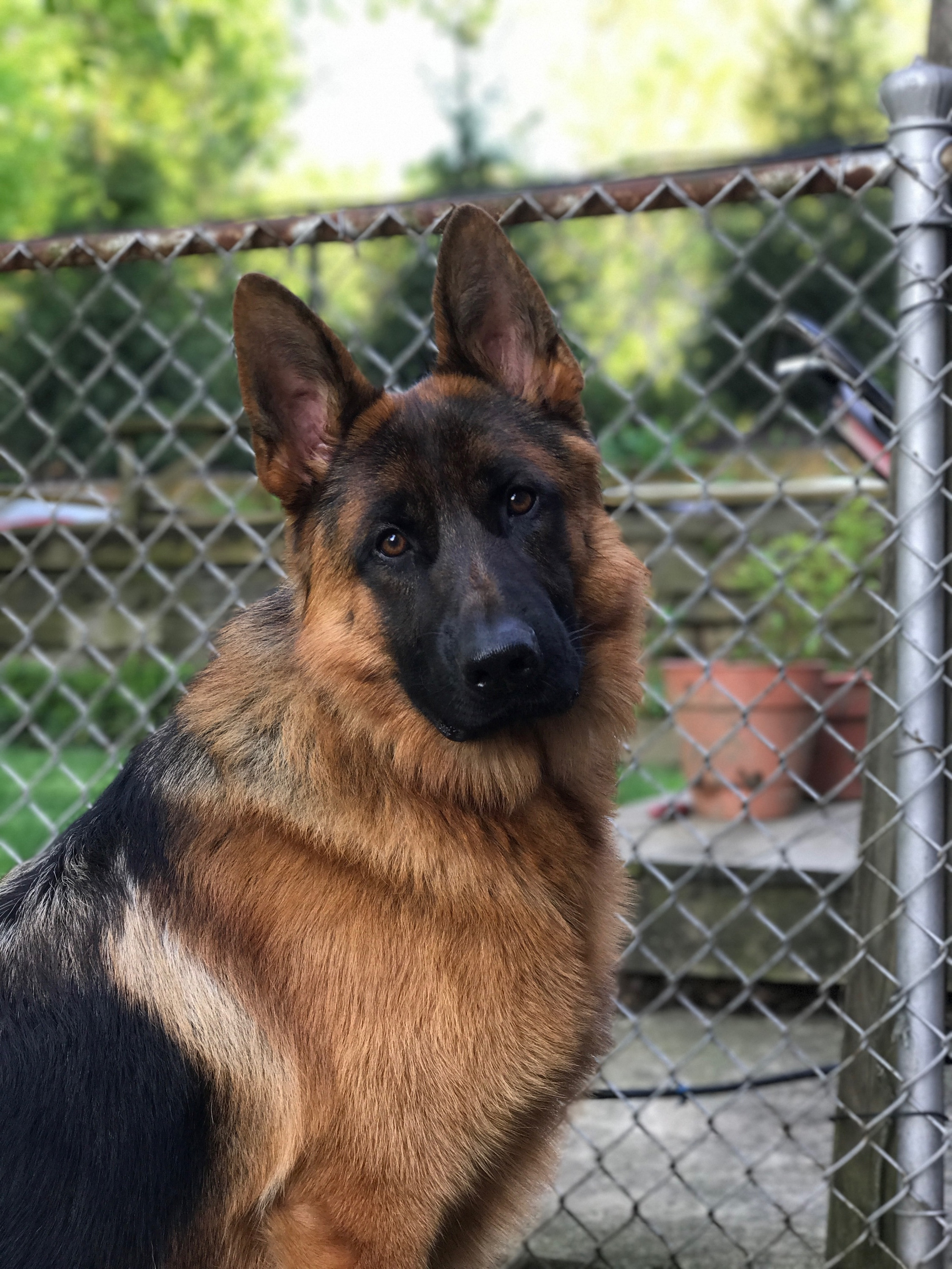 Laci is a purebred GSD. On this particular day, she was enjoying herself as a young puppy on an A-Frame obstacle. She really likes being elevated. When reaching the peak, she stopped to take in the view. We weren't being timed so I thought it would be a great shot.