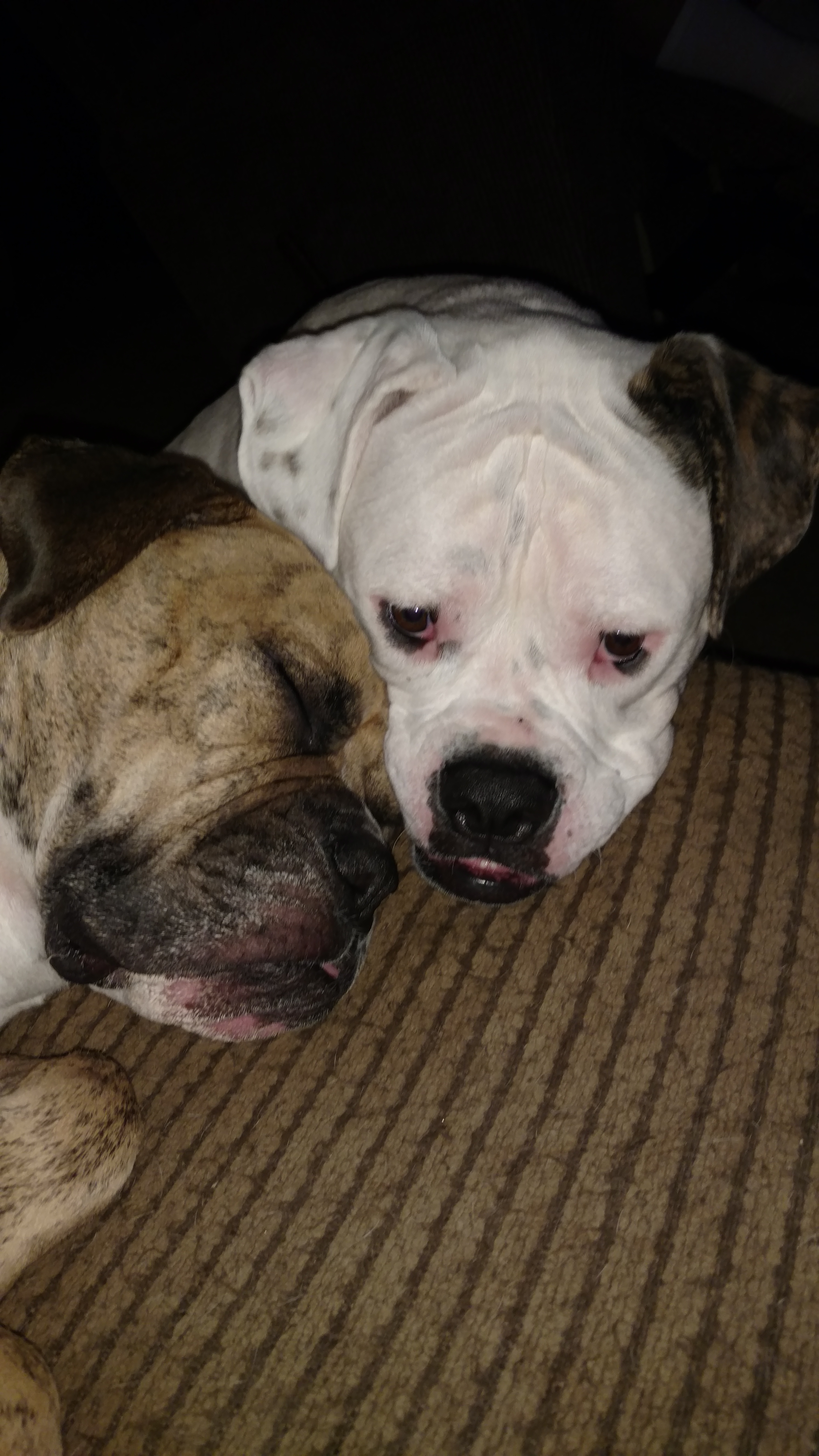 Justice the GSD and Raymond the rescue pit sharing a bone and a bed