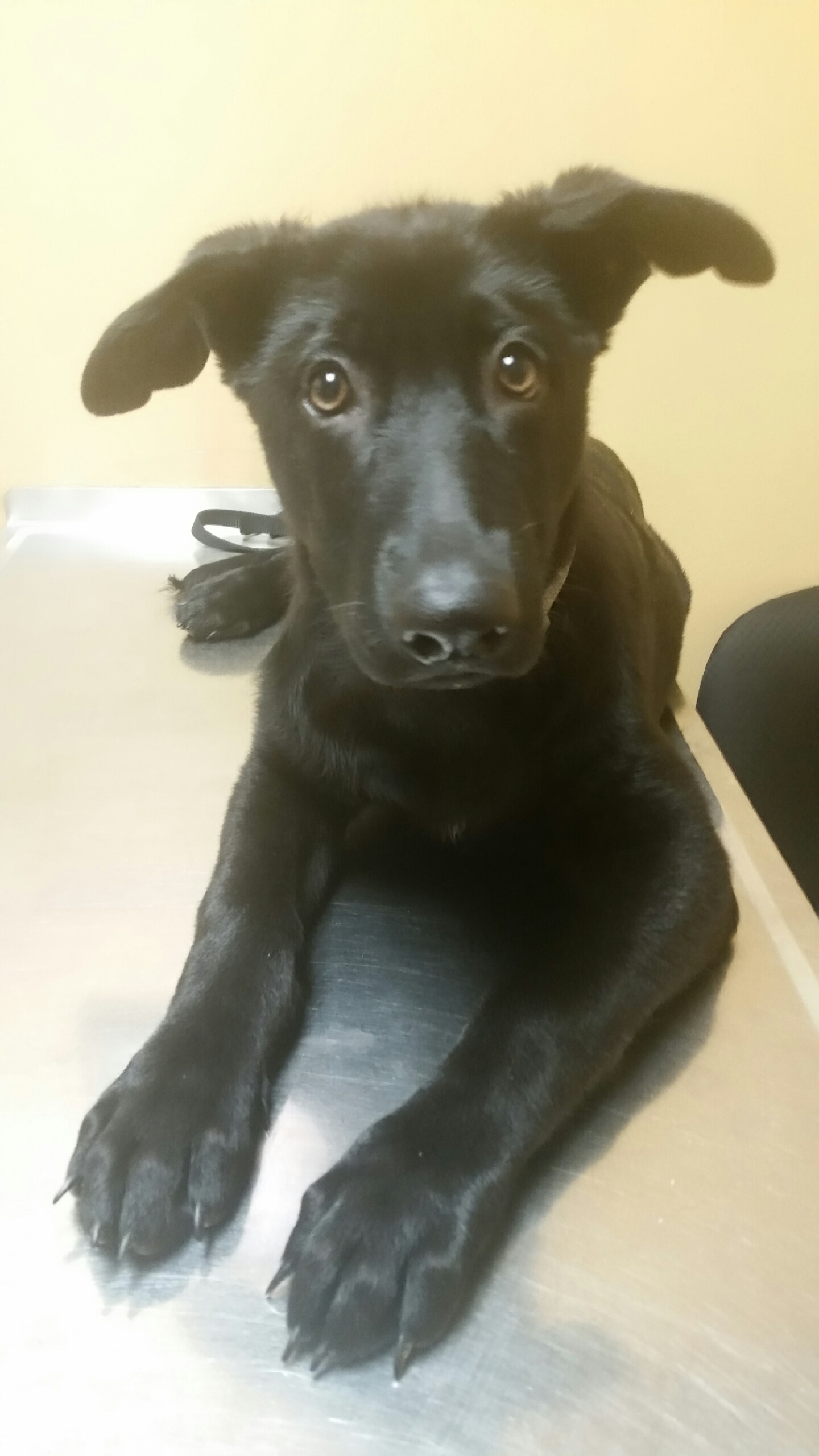 Photo of my Black GSD on her visit to the Vet for her last round of "puppy shots".