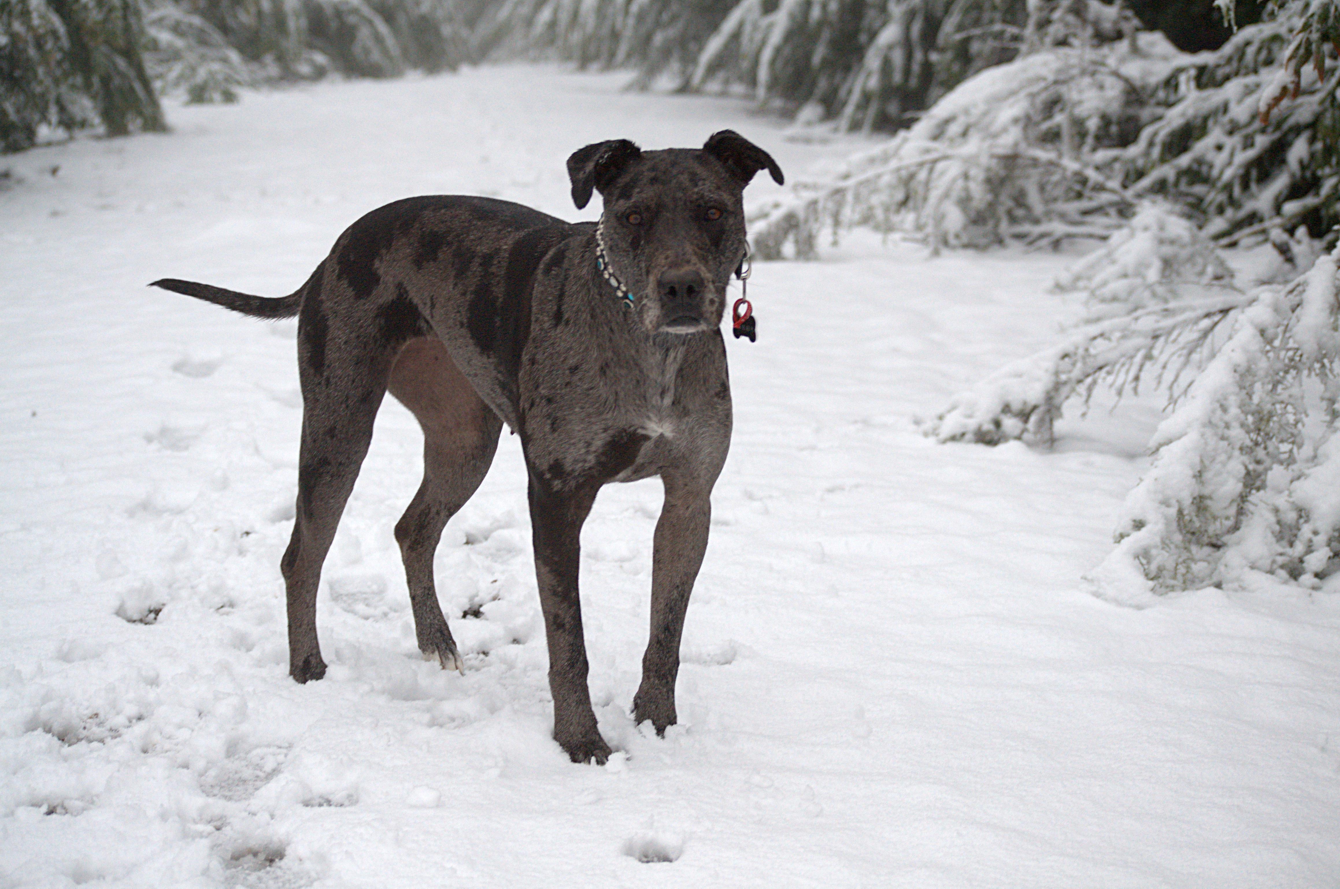 This is Thistle, my mixed breed's expression at the sight of her first snowball. She loves balls no matter the form