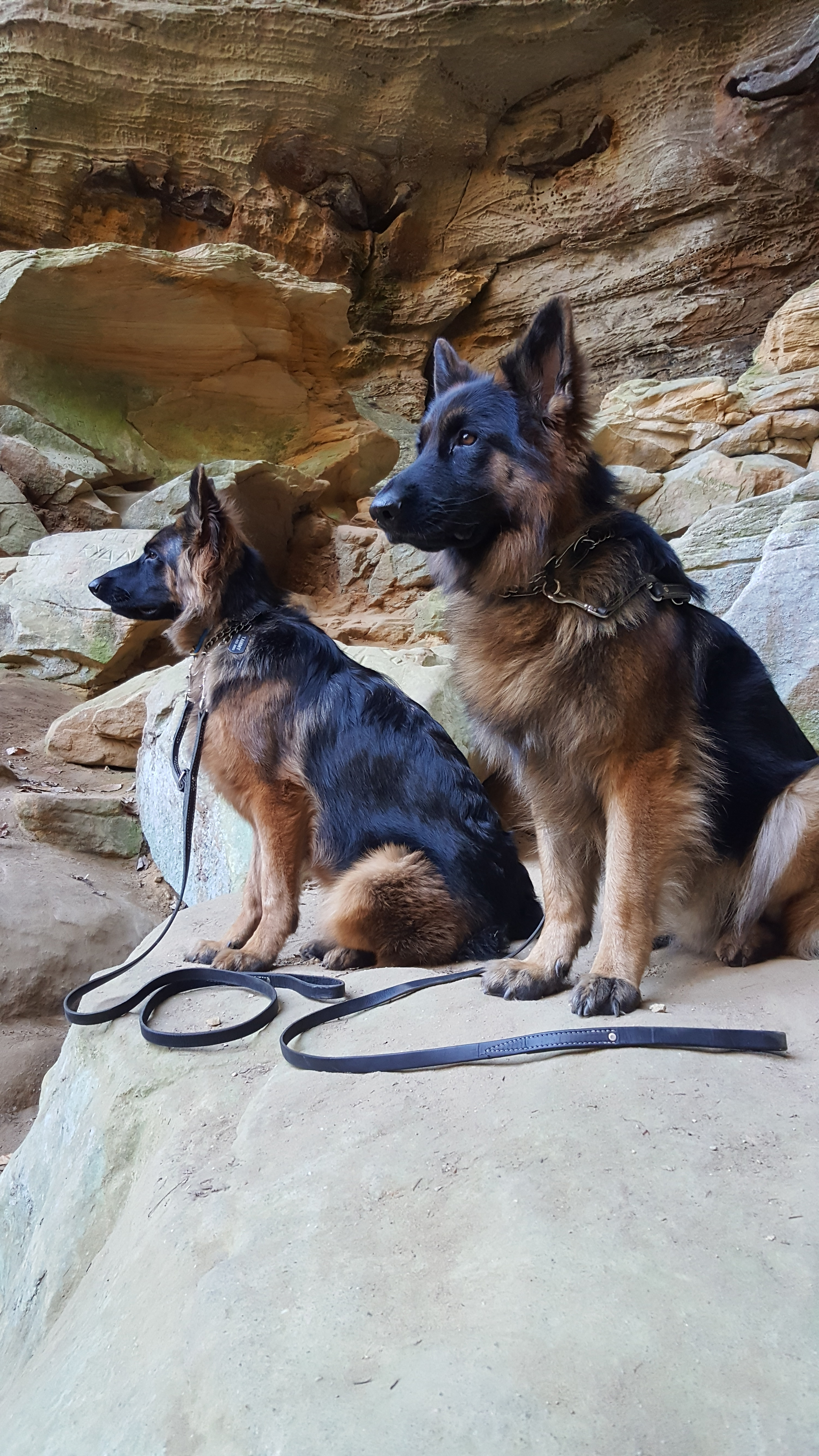 Stryder & Apache are long coat German Shepherds. They are brother and sister from different litters. In this picture, we were hiking in Hocking Hills, OH.