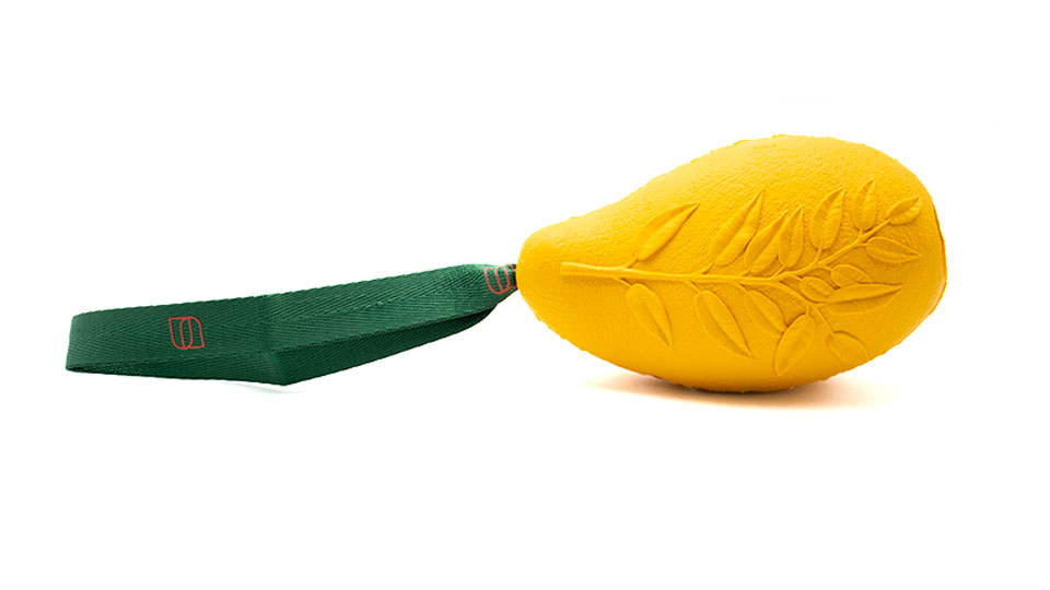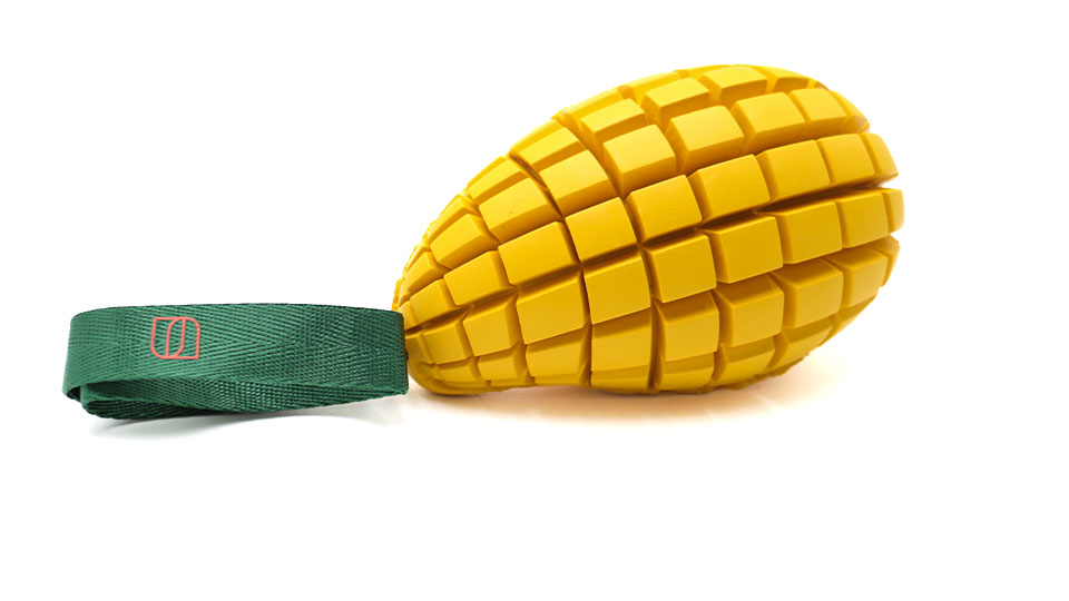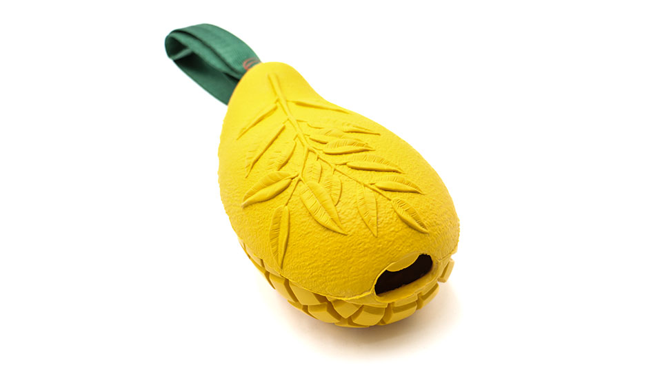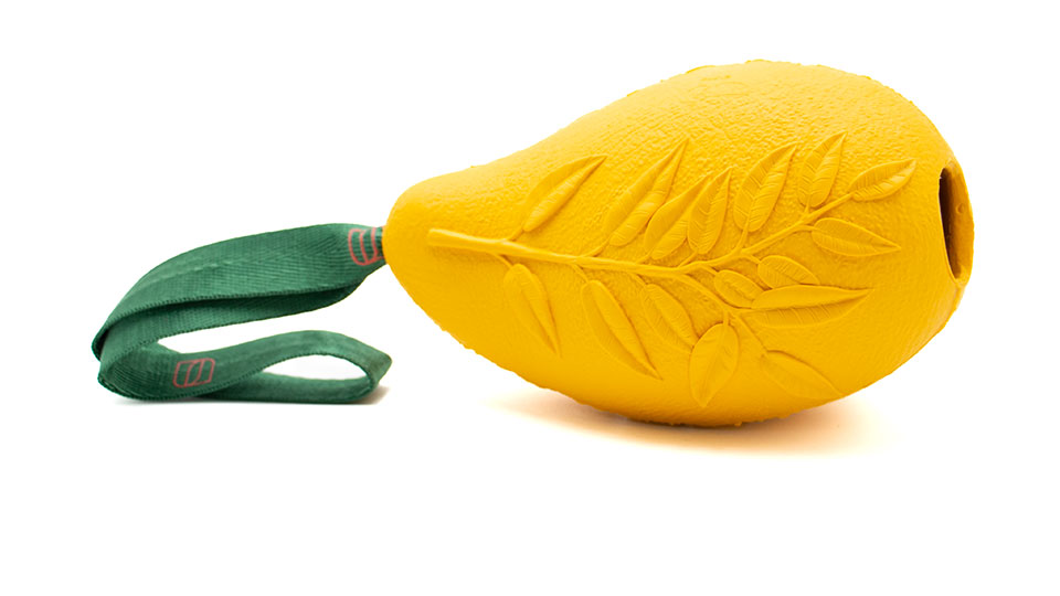 The Mango Dog Toy features a hole at the bottom for filling with treats. Softer treats can also be pressed into the cross-hatch pattern on the backside for your dog to lick clean — great for extended engagement and mental stimulation.