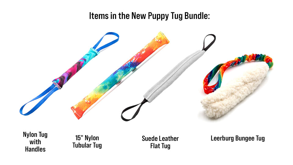 This bundle includes four versatile tug toys designed to build engagement, motivation, and play drive with your dog. Each tug offers a different texture and training purpose, making it a great set for everything from introducing tug to reinforcing training rewards. Durable and portable, these tugs are ideal for trainers and dog owners who want reliable toys for interactive play and training.